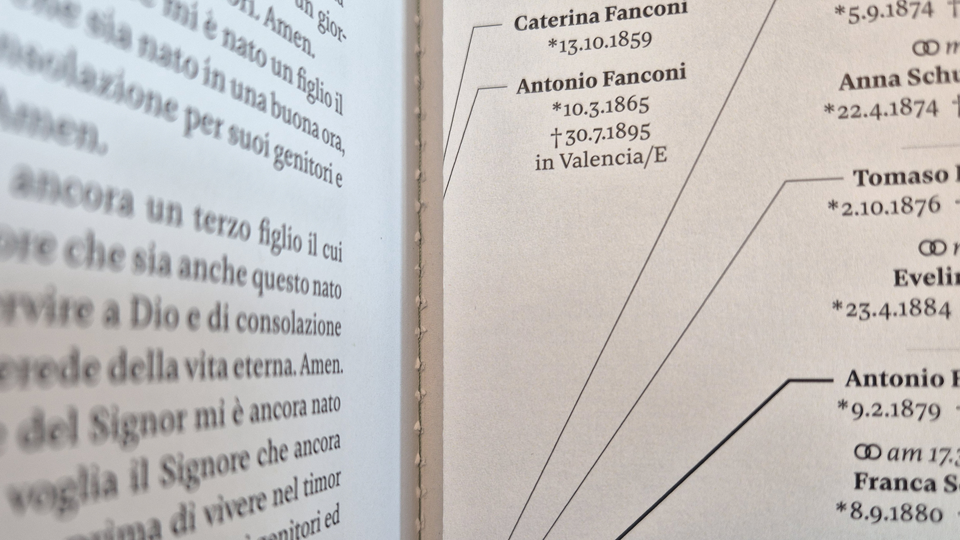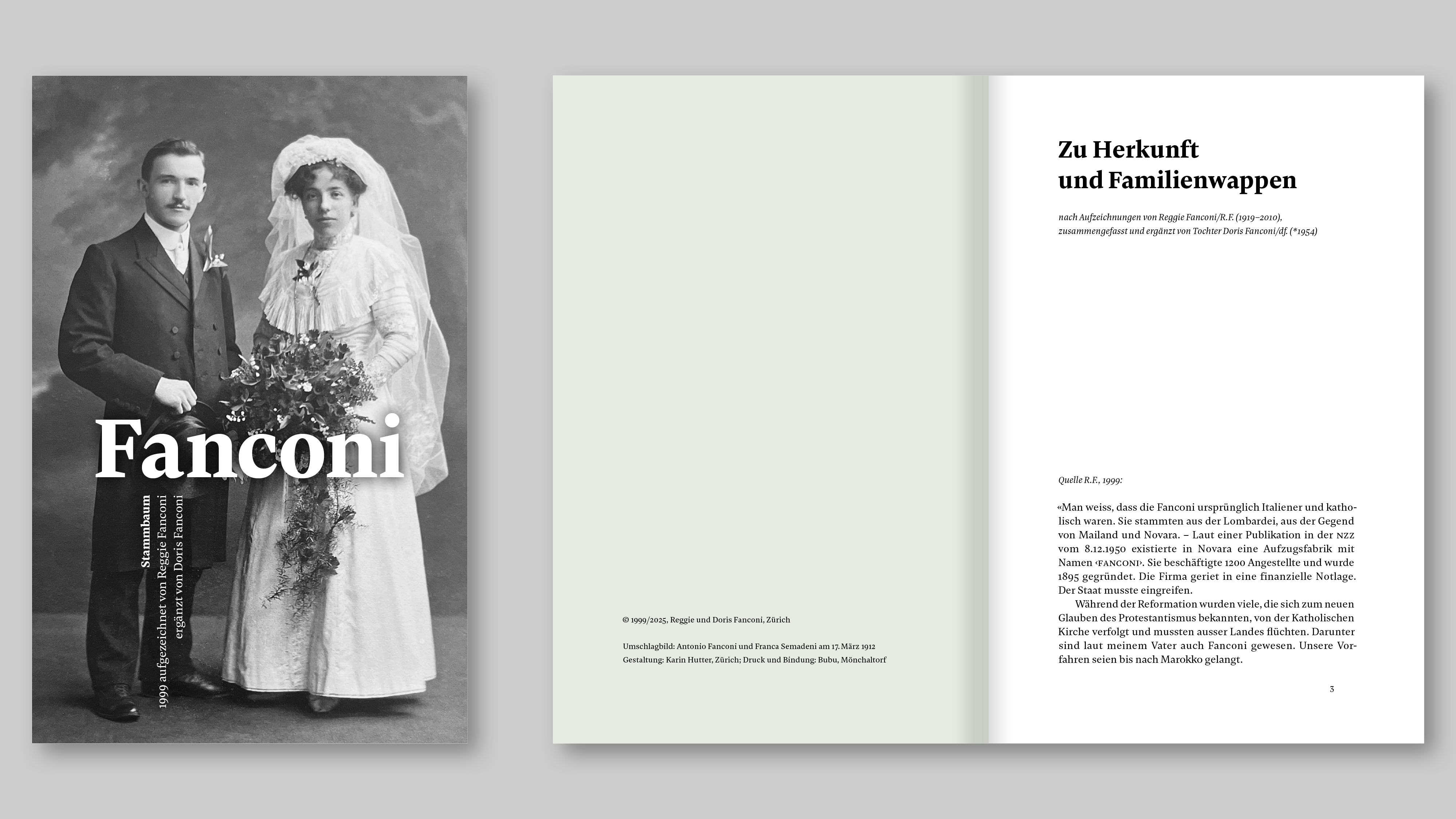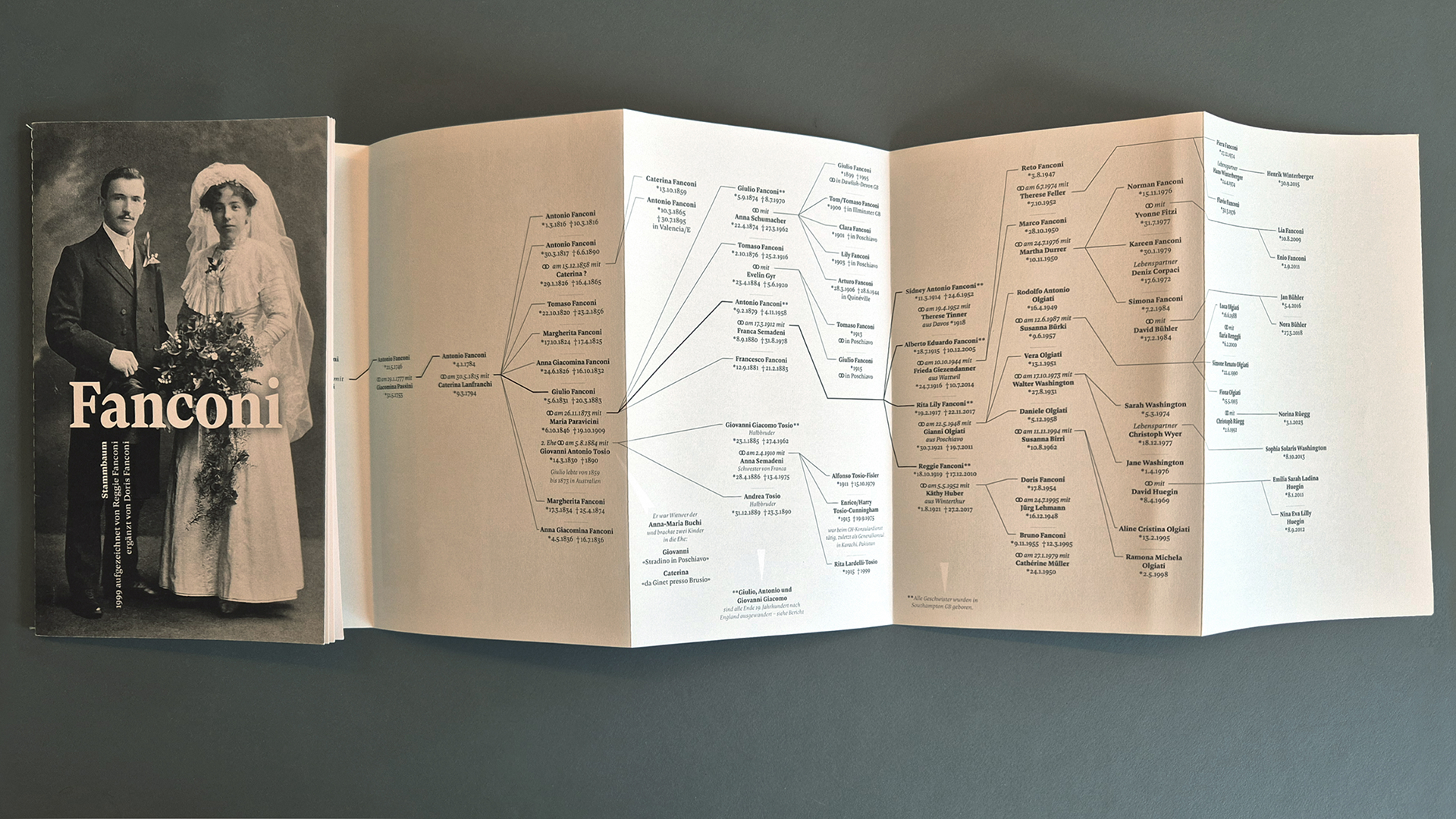 Broschüre mit Fadenheftung, 24 Seiten, Format A5, mit ausklappbaren Leporello, der den Stammbaum und Fotos der Familie Fanconi enthält.