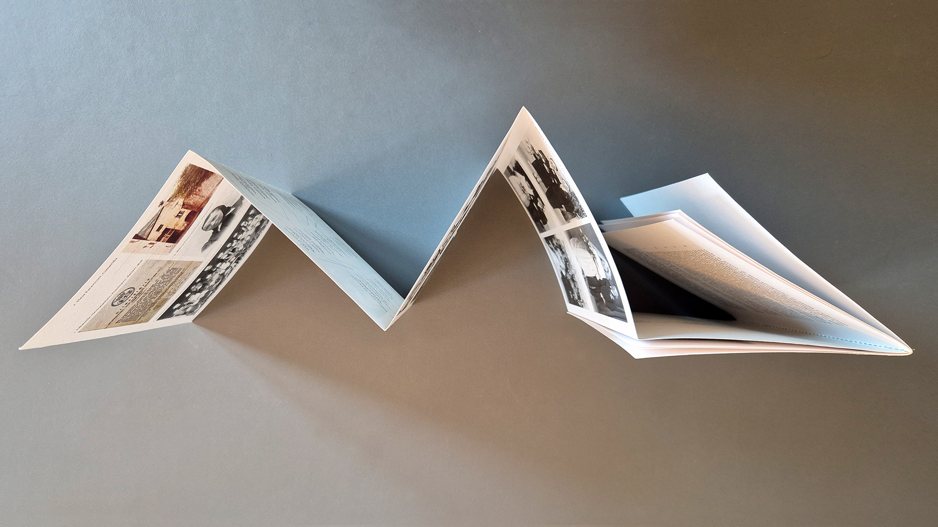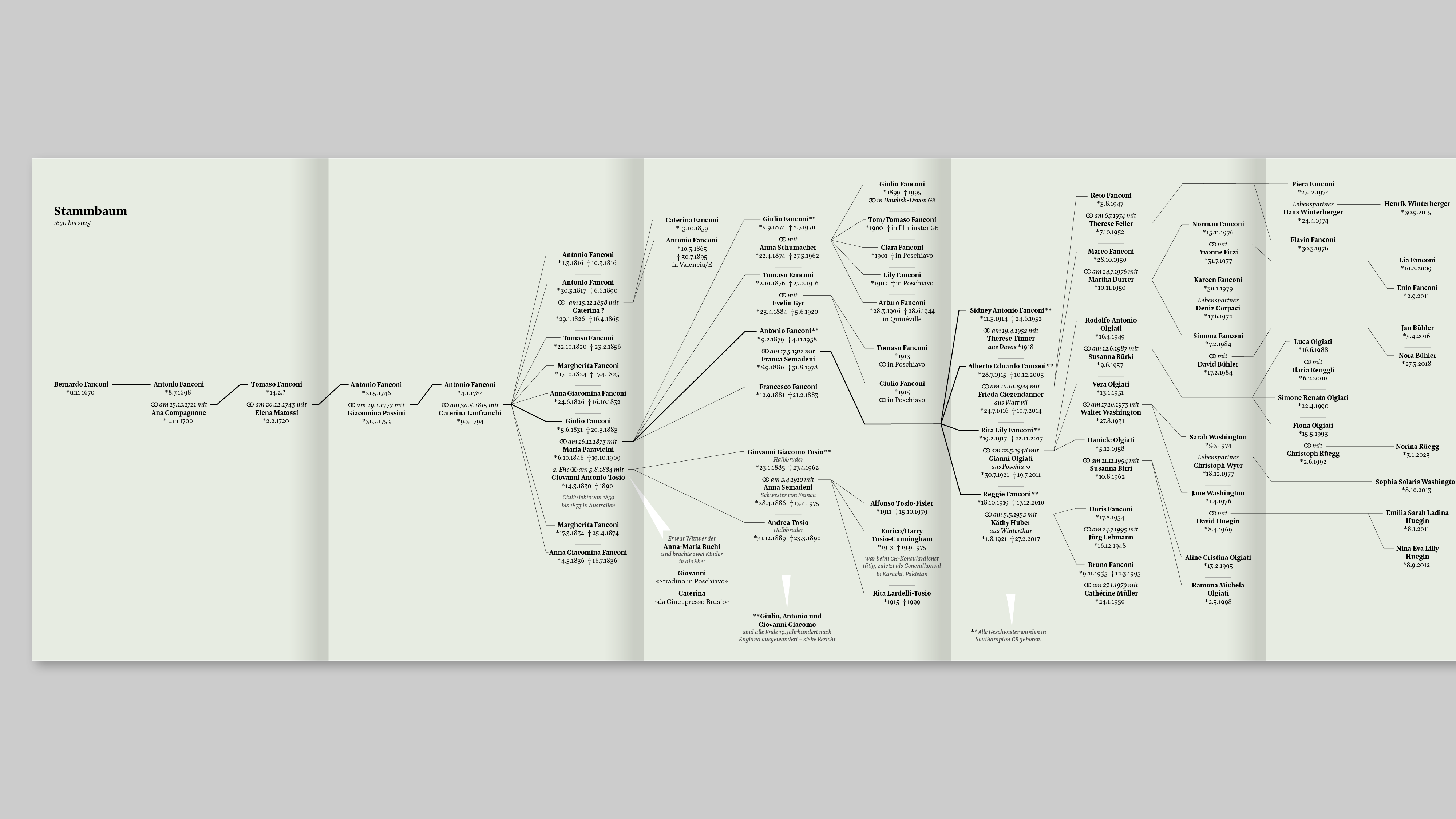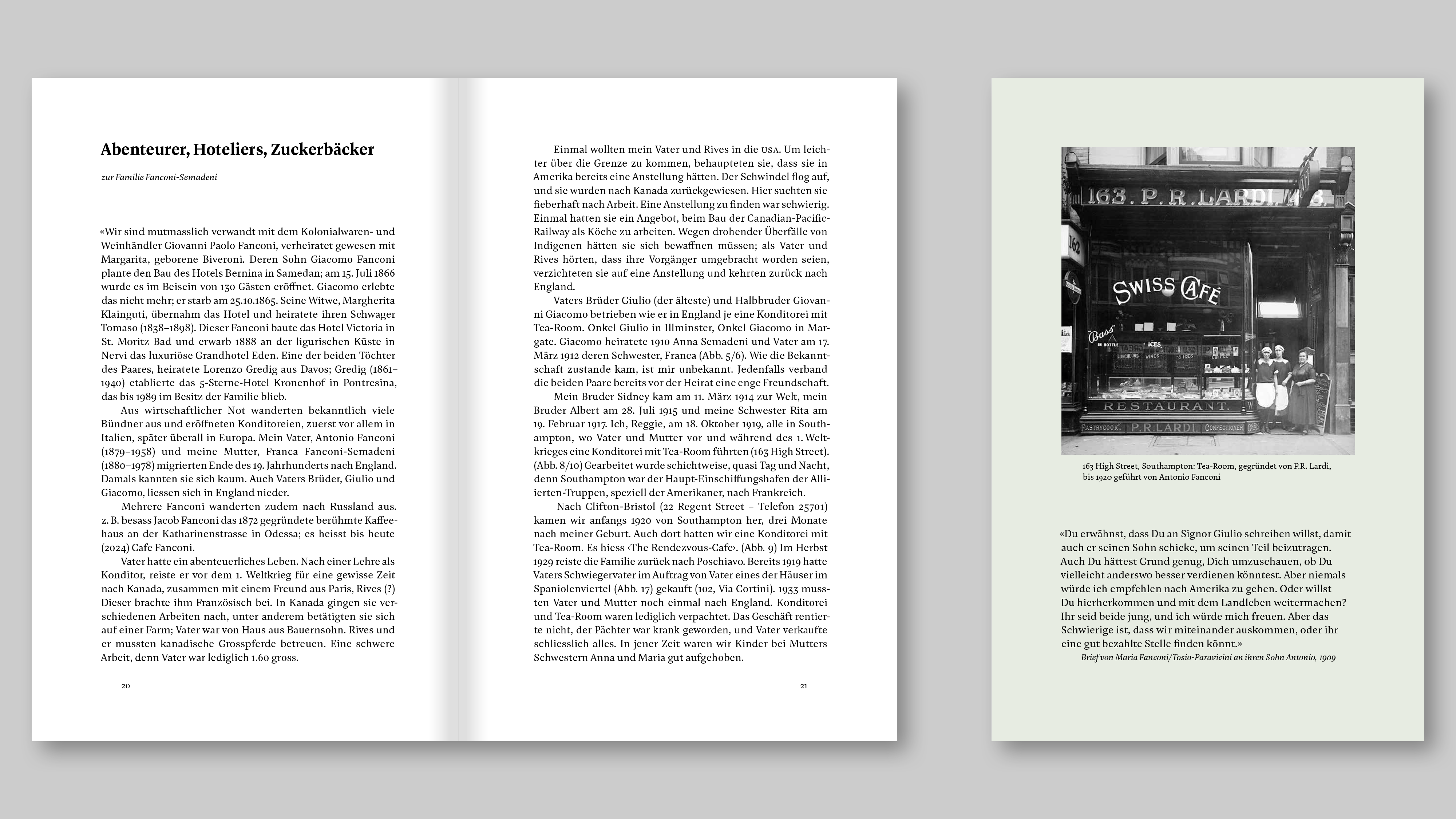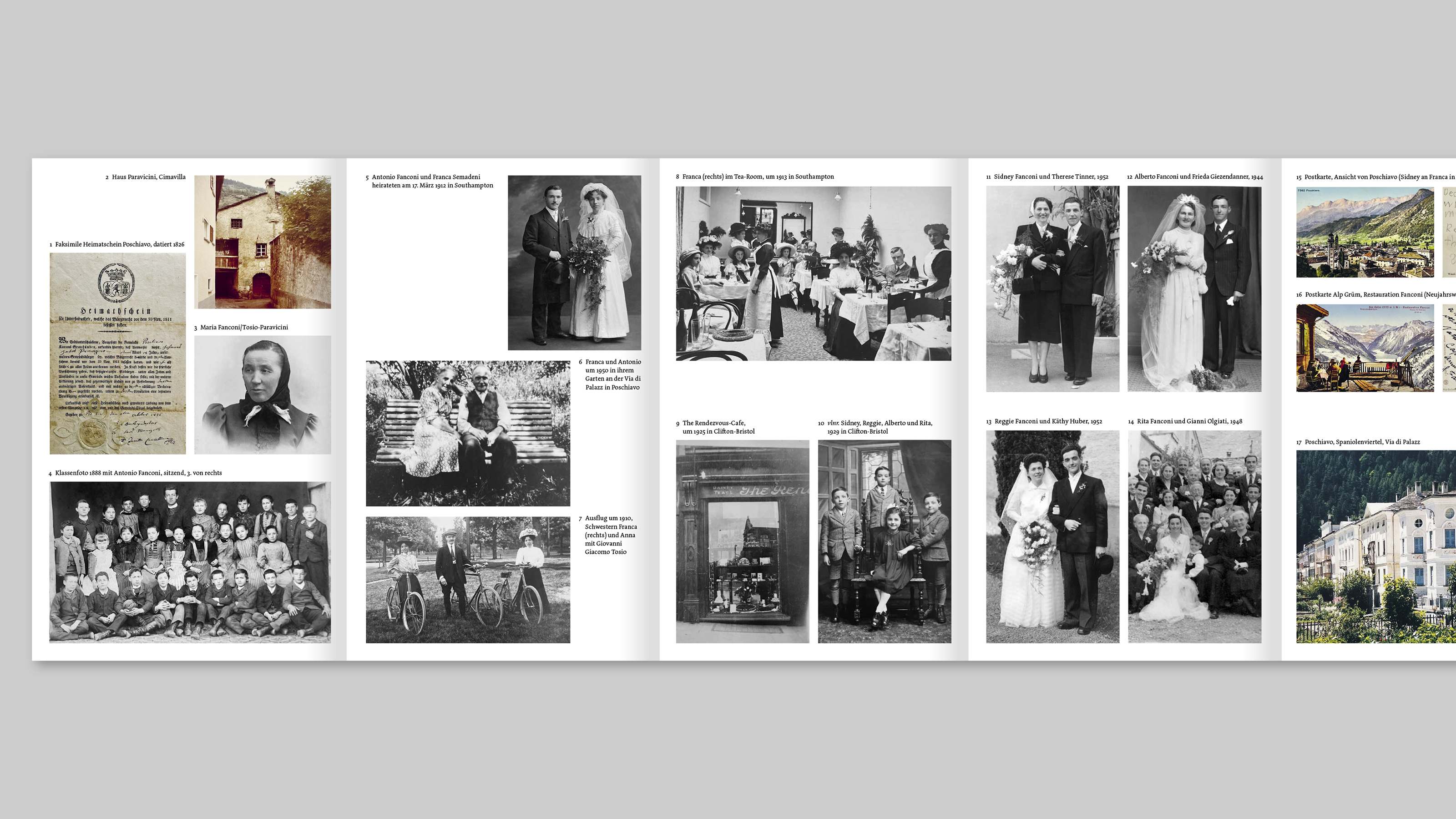 Broschüre mit Fadenheftung, 24 Seiten, Format A5, mit ausklappbaren Leporello, der den Stammbaum und Fotos der Familie Fanconi enthält.